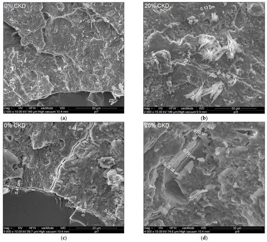 Figure 15a–d shows microphotographs of 0 and 20% CKD mixtures at magnifications of 2000× (a,b) and 5000× and 4000× (c,d), taken to quantify the occurrence of microcracks.