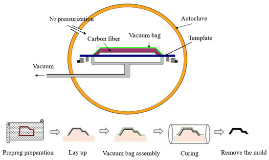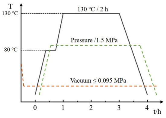 The CFRP material used in the experiment was fabricated using a hot-press molding process, with the fiber orientation set as a unidirectional 0° layup. The final laminated panel had dimensions of 1000 × 1000 mm2, as shown in Figure 1. The hot-press molding process, illustrated in Figure 2, commenced with the design of the layup for the laminated panel. An industrial automated cutting machine was employed to cut the prepreg into the desired shapes. Subsequently, the layup was performed, eliminating any entrapped gases, and the assembly was vacuum-sealed and cured in a high-pressure vessel. The curing conditions for the high-pressure vessel included a temperature of 130 °C, curing time of 2 h, and pressure of 1.5 MPa, as depicted in Figure 3. Following the curing of the CFRP composite material, the system was allowed to cool down to the safe operational range for temperature, pressure, and other parameters before stopping the process. Next, the burrs of the composite were removed and numbered for backup; finally, the desired specimen was cut.