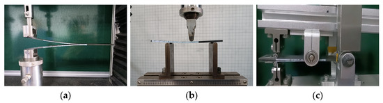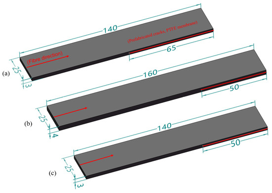 In accordance with ASTM D5528 [25], ASTM D7905 [26], and ASTM D6671 [27] standards, laminated panel specimens for Mode I (a), Mode II (b), and mixed-mode (c) interlaminar fracture were prepared. A 10 μm thick polytetrafluoroethylene (PTFE) film was embedded in the mid-plane of the laminated panel to create initial pre-existing cracks. The specimen dimensions are depicted in Figure 4.