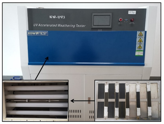 Following the ISO 4892-2016 [28] standard, an artificial indoor UV-irradiation-accelerated aging method was employed to age the CFRP laminated panel specimens in a UV aging test chamber. The laboratory light source UVA-340 was selected to simulate global solar UV radiation. Three different blackboard temperatures (70 °C, 60 °C, and 50 °C) were set for aging, and the aging periods were chosen as 10 days, 20 days, 30 days, and 50 days. The aging process consisted of cycles with a duration of 12 h each, comprising 8 h of dry UV irradiation and 4 h of condensation stage (without UV irradiation). The UV aging tests were conducted using the KW-UV3-A UV aging test chamber from KOWINTEST (Dongguan, China), as shown in Figure 5. The aging chamber was equipped with eight fluorescent UV lamps with a wavelength of 340 nm, each with a power of 40 W, and the irradiance of UV light was set to 1 W/(m2·nm). The UV irradiation aging conditions are detailed in Table 3.