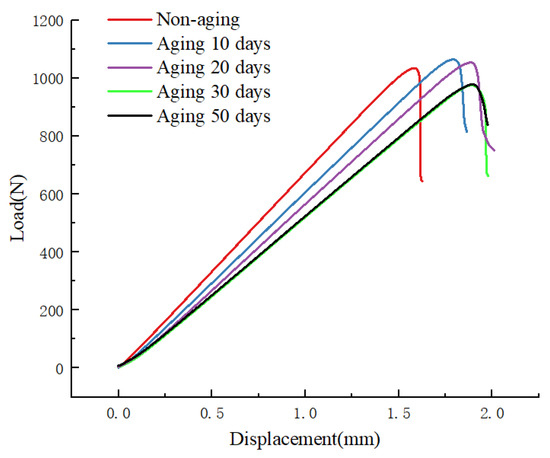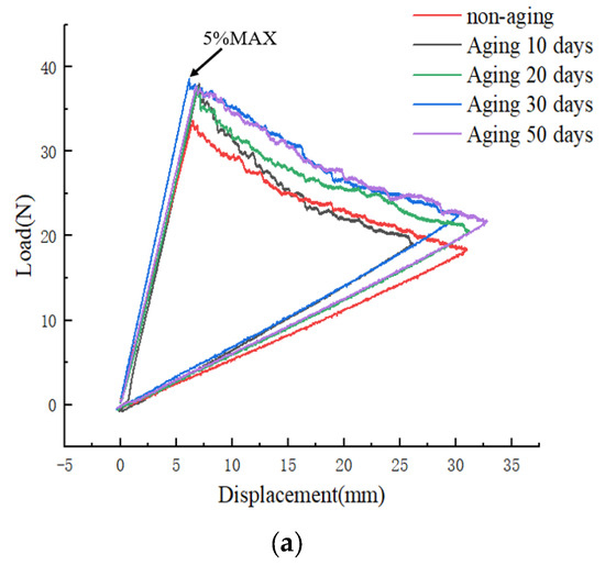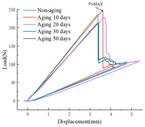 Figure 12 depicts the load–displacement curves from mixed-mode fracture tests conducted at a constant aging temperature of 70 °C for various aging durations. Analysis of the graph indicates that the 5% MAX load value for the non-aged specimen is 236.41 N. With increasing aging time, the maximum load exhibits an initial ascent followed by a gradual decline. After 50 days of aging, the 5% MAX load value decreases to 213.50 N, representing a reduction of 9.7% compared to the non-aged specimen.