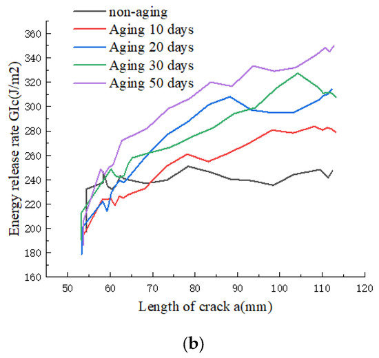 Figure 7 shows the Load–displacement curves (a) and R-curves (b) of type I fracture tests with different aging days at a constant aging temperature of 70 °C. From Figure 7a, it can be observed that the 5%MAX load value for the non-aged specimen is 33.7 N. With increasing aging time, the maximum load values exhibit a gradual upward trend. After aging for 50 days at 70 °C, the 5%MAX load value reaches 37.8 N, representing a 12.2% increase compared to the non-aged specimen. This phenomenon suggests that UV aging renders the CFRP material less susceptible to crack propagation in Mode I interlaminar fracture toughness testing, resulting in an enhancement of the specimen’s Mode I fracture toughness. The fracture energy release rate results are depicted in Figure 7b.