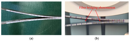 The origin of fiber bridging lies in the occurrence of delamination between the matrix and fibers under tensile stress, forming interlaminar cracks. When these cracks extend to adjacent fiber layers, some fibers, owing to their high tensile strength and elastic modulus, do not immediately rupture. Instead, they form bridges on either side of the crack, thereby enhancing the toughness of the composite material [30,31].