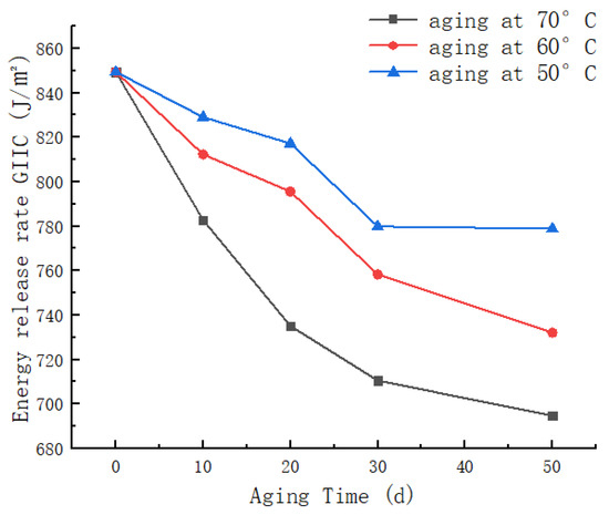 The curves depicted in Figure 11 illustrate the variation of Mode II energy release rate () with aging time under different aging temperatures. Analysis of this graph reveals that, at a constant temperature, longer aging times correspond to lower energy release rates. Specifically, the non-aged specimen exhibits a Mode II energy release rate () of 849.4 J/m2, which decreases to 694.8 J/m2 after 50 days of aging at 70 °C, representing an 18.2% reduction compared to the non-aged specimen. When the aging duration is constant, higher aging temperatures result in a more pronounced and faster decline in the specimen’s energy release rate. The 50-day aging at 70 °C shows a 10.8% greater reduction compared to aging at 50 °C. This phenomenon is attributed to the UV aging-induced weakening of interlaminar bonding in CFRP, and the increasing extent of fiber-matrix debonding with prolonged aging time and elevated aging temperatures in the ENF specimens. This, in turn, affects the specimen’s resistance to crack propagation and failure, leading to a gradual decrease in Mode II energy release rate (). Furthermore, the analysis of Figure 11 indicates a gradual decrease in the slope of the curve with increasing aging time, suggesting a noticeable slowing of the rate of decline in Mode II energy release rate. This effect becomes particularly prominent after 30 days of aging, potentially indicating that UV-induced damage to the matrix and fiber/matrix interface in the CFRP laminate reaches saturation, resulting in the energy release rate reaching its lowest point.