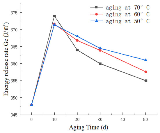 As depicted in Figure 9, the curve illustrates the variation of Mode I energy release rate () under different aging temperatures and durations. From the graph, it is evident that, at a constant temperature, longer aging times correspond to higher energy release rates. The mean value of for the non-aged specimens is 241.6 J/m2, reaching 294.9 J/m2 after 50 days of aging at 70 °C—an increase of 22.1%. This phenomenon can be attributed to the weakening of interlaminar interface bonding in the CFRP laminate with increasing aging time. However, the fiber bridging phenomenon on the upper and lower surfaces of the interlaminar region becomes more pronounced. Additionally, the condensation phase during UV aging leads to moisture absorption in the CFRP laminate, facilitating enhanced fiber bridging. Ultimately, this contributes to the observed increase in Mode I energy release rate. Moreover, under the same aging duration, higher aging temperatures result in a faster rate of change in Mode I energy release rate and elevate the upper limit of the increase in Mode I energy release rate.