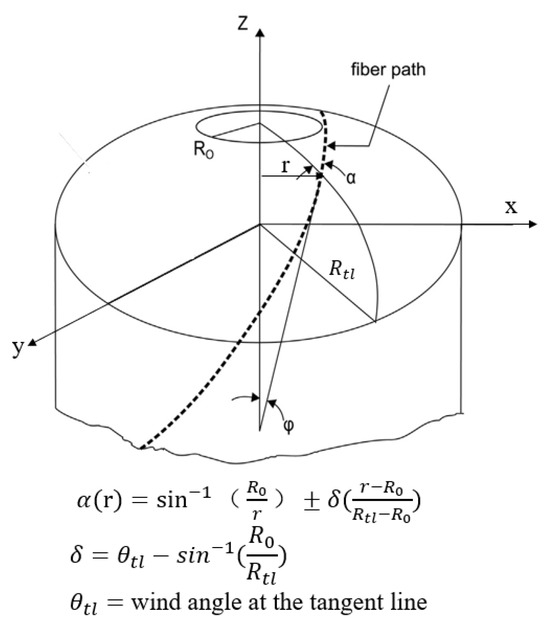This method involves the utilization of the Wound Composite Modeler (WCM), which is an ABAQUS plugin tool designed for convenient modeling of composite pressure vessels. In conventional analytical approaches, the continuously changing shape of the dome section, fiber overlapping, and variations in thickness and angles make analysis challenging. By contrast, The WCM can calculate the changes of fiber angles over the dome, and applies it to the finite element model (FEM) [32]. The underlying principles are illustrated in Figure 15 [33]. Therefore, the WCM enables accurate analysis of the entire vessel.