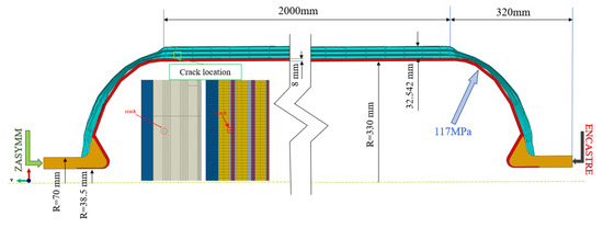 Using the finite element analysis software Abaqus-WCM (2017), a Type IV composite hydrogen storage cylinder with a pre-existing crack is modeled. The bottom opening of the cylinder is constrained with ENCASTRE, while the top opening adopts ZASYMM constraints, ensuring U1 = U2 = UR3 = 0. The structural configuration, dimensions, crack location, boundary conditions, and loading are depicted in Figure 16.
