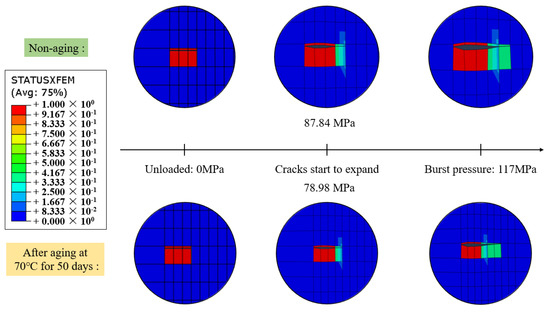 A minimum burst pressure of 117 MPa was applied to observe the extension of cracks in the cylinder winding under high-pressure loading conditions. The comparison of crack extension states before and after aging is presented in Figure 18. STATUSXFEM represents the crack extension status, with numerical values ranging from 0 to 1. A value of 1 indicates complete cracking within the element, 0 signifies no cracks within the element, and other values represent incomplete cracking within the element.