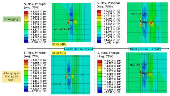 Figure 19 displays the maximum principal stress contour plots before and after material aging under an internal bursting pressure of 117 MPa and at the initiation of crack propagation. After 50 days of aging at 70 °C, under the same pressure conditions, the crack propagation length increases, and the maximum principal stress at the crack tip rises to 4.943 GPa, representing a 3.87% increase compared to the non-aged state.