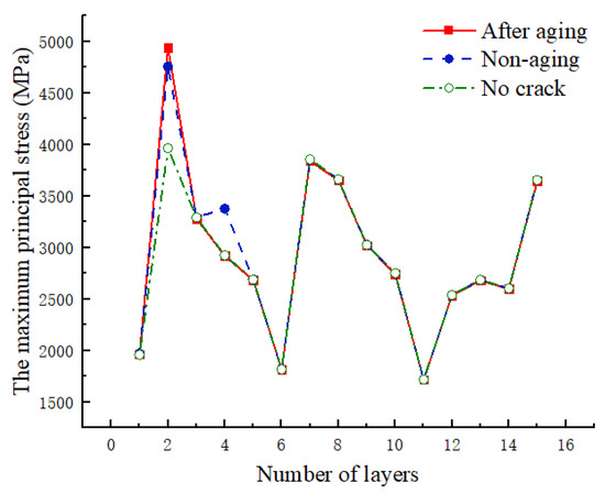 As shown in Figure 20, the relationship curve between the maximum principal stress and the layers is presented before and after UV aging at 117 MPa. In comparison to the case without a crack, stress concentration occurs at the crack tip in the second layer, leading to a noticeable increase in the maximum principal stress in the second layer. In the presence of a crack, the maximum principal stress in the second layer increases after UV aging. The third layer, not located at the crack tip, exhibits minimal difference before and after aging. In the fourth layer, the varying extent of crack propagation results in a noticeable difference in stress concentration at the crack tip. The maximum principal stresses in the other layers show minimal variation.