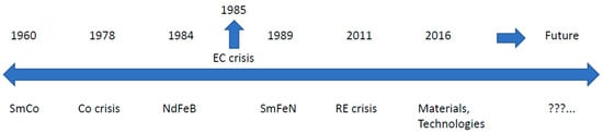 We will concentrate more on RE-TM magnets, where RE stands for Nd and Sm and TM for Fe and Co, and not so much on ferrites. Before the discovery of Nd-Fe-B magnets in 1984 [11,12], the major players were ferrites, Sm-Co (50 wt.% Co), and Alnico (15 wt.% Ni, 30–35 wt.% Co) magnets. For demanding, high-temperature applications, Sm-Co magnets were dominant (high-performance, high-temperature, defense-related uses). They were developed in Dayton, USA, by the group of K. Strnat [13], who was originally working on the Y-Co system. As recalled by Alden Ray [14], the triggering event was “There was quite some unused Sm pilling up in a backyard, so one day we thought, let us mix it with Co and see what happens”. Eventually, a new compound was discovered—firstly SmCo5; followed by Sm2Co17; both of which proved to be successful [15]. Raw-material prices and availability were of no particular concern then, but at the end of the 1970s, the so-called cobalt crisis occurred and then reappeared in 2008 and 2018 (as shown in Figure 3—collected from references [16,17,18]).