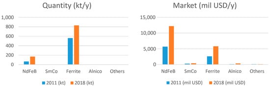 (Left) Permanent-magnet consumption by weight (2011 compared to 2018) in thousands of metric tons. (Right) Permanent-magnet usage in terms of annual turnover (2011 compared to 2018 in millions of US dollars per year) [10].