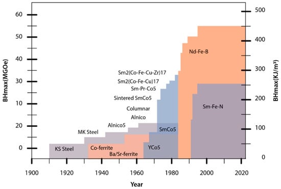 (BH)max values of different permanent magnets developed over the years.