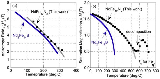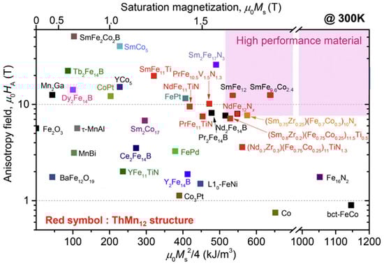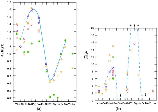 (a) Saturation magnetization vs. RE used in RE2Fe14B; (b) Anisotropy field vs. RE used in RE2Fe14B, reported by various authors. The symbols represent results from different authors. A detailed list can be found in Reference [21].