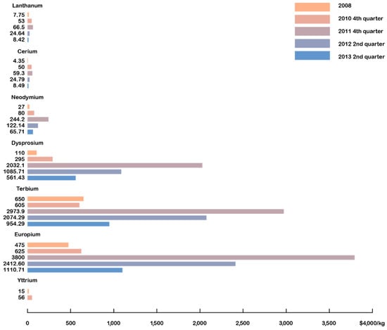 What we today call the rare-earths crisis began at the end of 2010 and reached a peak in March 2011, lasting until August 2011 [25]. It resulted in sharp price rises, especially for the heavy rare earths (HREs) (as shown in Figure 6 for selected REs), and raised many questions about affordability, availability, and the potential monopolization of resources by China.