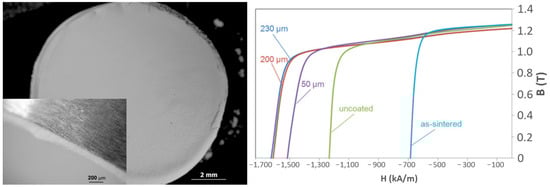 To achieve those local dispersions of Dy and Tb, their ceramic precursors are used on top of already sintered magnets. These small additions are very much in line with the scarcity of HREEs like Dy and Tb. What is happening is that the heavy rare earths are then diffused into the magnet and substitute Nd in the matrix phase, producing a so-called core-shell structure, which prevents easy demagnetization when exposed to an external reverse magnetic field. By adding less than 1 wt.% Dy, the coercivity can be increased by more than 25%, which is shown in Figure 8 [32]. This was an outcome of the FP7 European project ROMEO (Replacement and Original Magnet Engineering Options), where an innovative approach to minimizing the amount of HRE needed was developed.