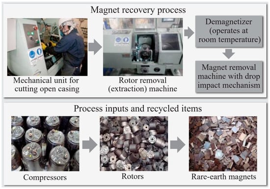 The recycling of Nd–Fe–B permanent magnets (mainly sintered) from EOL products is nowadays categorized as a “key enabling technology” for positioning REs within the circular economy. Sintered Nd–Fe–B PMs are really multi-phase materials. The hard magnetic phase represents only 85–87% of the whole magnet; the rest are Nd-rich grain-boundary phases (GBPs) that also contain Nd-oxide phases [46]. Today, there are different techniques available to recycle Nd-Fe-B magnets. They can be divided into reusing, reprocessing, and remelting. The most economically viable route is the reuse of EOL magnets without changing the chemical structure of the magnet. This is only used for generators and motors in wind turbines and EV/HEVs. A mechanical dismantling and separation technique was developed by the Hitachi Group (Japan). They used a rotational drum to separate Nd-Fe-B magnets from hard disk drives (HDDs). Another technique they developed is recycling magnets from air conditioner compressors, which are cut off directly and further demagnetized thermally at 400–500 °C or by resonance damping demagnetization (Figure 9) [47,48].