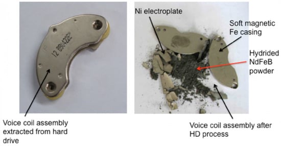 Another technique to separate the magnet from its environment was developed by the University of Birmingham. The HPMS (Hydrogen Processing of Magnet Scrap) was developed to retrieve environmentally friendly Nd-Fe-B powder environmentally friendly from end-of-life magnets [68,69]. As Nd-Fe-B magnets break down into a friable, demagnetized, hydrogenated powder that can be separated mechanically from the remaining impurities, like the nickel coating, by, e.g., tumbling electronics in a rotating hydrogen reactor and collecting the powder, the magnet-free component can now be recycled much more easily. This procedure is used by the company Hypromag Ltd., Birmingham, UK to develop a full recycling supply chain for rare-earth magnets. Figure 10 illustrates how the HPMS process pulverizes the Nd-Fe-B magnet of a hard disk drive.