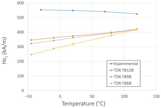 High-energy magnets without REEs have not been produced. To use PMs without REEs, we can choose among ferrites, alnico, and Fe-Co-Cr, but they do not match the properties that REE-based magnets can achieve. Because of the REE crisis, research in the EU was focused on finding alternatives to low-performance REE PMs in the intermediate energy-product range between 50 and 200 kJ/m3 [76,77,78,79]. Novel, low-cost hybrid magnets based on ferrites/alnicos, or any of their combinations represent an interesting and viable solution to close the above-mentioned gap in magnetic performance between ferrites and RE magnets. A promising development for low-temperature applications was doping ferrites with B2O3, affecting the temperature coefficient of coercivity, which, unexpectedly, switched sign, enhancing the effect of the temperature on the magnetic properties (Figure 11) [80]. Guzmán-Mínguez et al. improved the magnetic performance of strontium ferrite sintered magnets using silica by tuning sintering parameters [81].