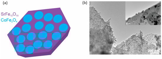 Exchange coupling between the hard and soft magnetic phases is one of the magnetic interactions that could lead to an increase in (BH)max [82,83]. The latter tends to increase with an increase in the coercivity, HcJ (the contribution of the hard phase), and/or the saturation magnetization, MS (the contribution of the soft phase) [84,85]. Therefore, by choosing wisely the constituent phases of the hybrid magnet, the energy product can be increased beyond the energy product of the hard phase alone [83]. Although this seems like an elegant solution, several requirements and restrictions have to be considered for an effective exchange. First, the constituent phases have to be in close contact, e.g., in the form of a core-shell structure [86,87,88], a layered structure [89,90,91], or as particulate composites [92,93,94,95]. Second, the particle size of the soft phase is limited by the selected hard phase. So, to effectively exchange the hard and soft magnetic phases, the particle size of the soft phase should not exceed twice that of the domain-wall width of the hard-phase material [83,88]. Some recent studies even indicated that for an efficient exchange coupling, the phases also need to have some degree of structural matching [96,97]. Furthermore, to increase the (BH)max of the composite as much as possible, the particle size of the hard phase should be at the limit of the single-domain particle size (to obtain the maximum coercivity). This means that for Sr-ferrite (or Ba-ferrite), if used in hard-soft magnetic composites, the preferred particle size would be around 1 µm, and the particle size of the soft-phase material should not exceed 28 nm [98]. The majority of the published research in the field of exchange-coupled composites is on powders only [95,99,100,101], and papers reporting increased (BH)max values based on exchange-coupled hard-soft bulk magnetic materials are scarce. Nevertheless, a (BH)max of 14.3 kJ/m3 for a hard-soft magnetic ceramic composite was reported by Debangsu Roy and P. S. Anil Kumar [102], in which they presented a hard-soft magnetic composite consisting of BaCa2Fe16O27 as the hard phase and Fe3O4 as the soft phase. Torkian and Ghasemi [103] presented SrFe10Al2O19/(x)Co0.8Ni0.2Fe2O4 composites with a (BH)max of 29.5 kJ/m3. During two European projects (the FP7 project Nanopyme [104] (GA 310516) and the H2020 project AMPHIBIAN [105] (GA 720853)), some encouraging results on sintered hybrid composites were obtained. Sr-ferrite/Co-ferrite bulk composites with a (BH)max of 26.1 kJ/m3 (a schematic and the actual prepared sample are presented in Figure 12) and hard-soft Sr-ferrite/(Mn, Zn)-ferrite hybrid magnets with a (BH)max of 23.7 kJ/m3 were prepared. A lot of efforts have been devoted to the research of modified or new magnetic materials that would fill the gap between REEs-based PMs and ferrites, but the vast combination of possible candidate materials, the preparation and consolidation conditions, and the fact that some options are viable only in theory make this task a highly demanding one, and so the quest to find a new magnet with improved properties continues.