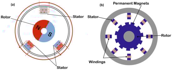 - Jack, A.G.; Mecrow, B.C.; Haylock, J.A. A Comparative Study of Permanent Magnet and Switched Reluctance Motors for High Performance Fault Tolerant Applications. In Proceedings of the Conference: IEEE/Industrial Application Society Conference, Orlando, FL, USA, 8–12 October 1995; Volume 32. [Google Scholar]