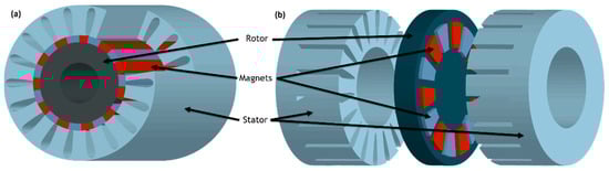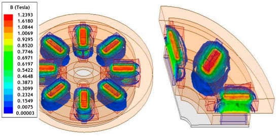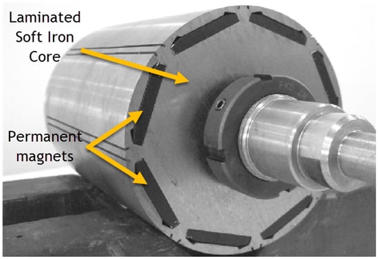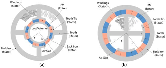 - Sorgdrager, A.J.; Grobler, A.J. Influence of Magnet Size and Rotor Topology on the Air-Gap Flux Density of a Radial Flux PMSM. In Proceedings of the 2013 IEEE International Conference on Industrial Technology (ICIT), Cape Town, South Africa, 25–28 February 2013; pp. 337–343. [Google Scholar]