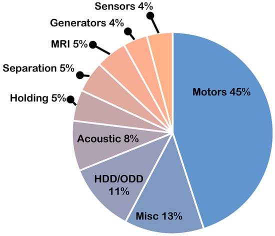 To be fair to non-metallic, but still hard, magnetic materials, around 80% by weight of today’s permanent magnets are still sintered hard ferrites, as shown in Figure 2 left, and 70% of this ends up in various motors. On the other hand, around 65% of the market value is Nd-Fe-B (Figure 2 right), and again, about 70% of this ends up in motors of all kinds.