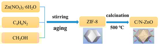 As shown in Figure 1, C-, N-co-doped ZnO nanoparticles with ZIF-8 as the precursor were prepared via a high-temperature calcination method. The synthesised ZIF-8 powder was placed in a ceramic crucible and subsequently transferred to a muffle furnace. It was then calcined for 2 h at a heating rate of 2 °C/min to reach temperatures of 300 °C, 400 °C, 500 °C, and 600 °C, respectively. The resulting powders were labelled ZIF-8-300, C/N-ZnO-400, C/N-ZnO-500, and C/N-ZnO-600, respectively.