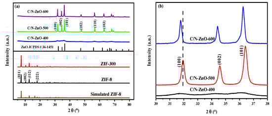 Figure 2a shows the X-ray diffraction (XRD) spectra of the as-prepared samples. The peak positions of ZIF-8 matched with the simulated peak curve results, indicating the successful preparation of ZIF-8. Peaks at 2θ of 7.39°, 10.40°, 12.77°, 14.75°, 16.50°, 18.08°, 19.53°, and 26.75° corresponded to the (110), (200), (211), (220), (013), (222), (123), and (134) crystal planes of ZIF-8, respectively [24,25]. Compared with ZIF-8, ZIF-8-300 exhibited no significant change in the XRD peak, indicating that ZIF-8 featured good thermal stability at 300 °C and that no phase transition occurred. The ZnO-400 sample featured a weak characteristic diffraction peak of ZnO, while the characteristic peak of ZIF-8 was nonexistent, which indicates that the transition from ZIF-8 to ZnO started to occur when the temperature reached 400 °C and that, at this time, ZnO was in a partially amorphous state with poor crystallinity, low peak intensity, and broadening. When the temperature reached 500 °C and 600 °C, the characteristic peak intensity of ZnO was gradually enhanced and sharpened, indicating that the increase in temperature favoured the growth of ZnO grains and crystallinity. Additionally, the diffraction peaks of ZnO were slightly shifted toward a smaller angle with the increase in calcination temperature. This is attributable to the thermal decomposition of the ZIF-8 precursor, causing the incorporation of C and N into the ZnO lattice. This resulted in lattice distortion and alterations in the crystal spacing.