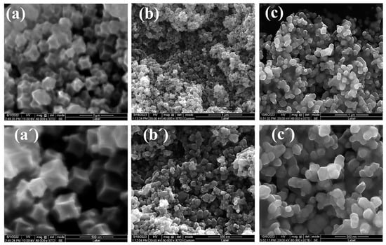 Figure 4 shows the SEM images of C/N-ZnO-x. According to Figure 4a,a′, C/N-ZnO-400 exhibited a hexahedral square-block granular morphology, with each face displaying a noticeable concave feature. A significant morphological change occurred compared with ZIF-8-300, indicating the transition from ZIF-8 to ZnO upon calcination at 400 °C. From Figure 4b,b′,c,c′, it can be seen that the morphology of C/N-ZnO-500 and C/N-ZnO-600 samples is agglomerated irregular particles, that the edge contour becomes blurred, the morphology of ZnO changes gradually with the increase in calcination temperature, and the size of the particles decreases and then increases. Notably, C/N-ZnO-500 exhibited the smallest particle size. According to the SEM and XRD results, the crystallinity of ZnO gradually increased with the increase in calcination temperature.
