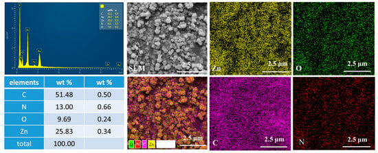 Figure 5 presents the energy-dispersive X-ray spectroscopy (EDS) elemental spectrum and the corresponding elemental mapping of C/N-ZnO-500. The spectrum displayed the presence of C, N, Zn, and O elements in C/N-ZnO-500, with a uniform distribution. In addition, it can be seen that the content of element C is significantly high compared to the other elements, which is due to the presence of C in the conductive adhesive, in addition to the doping of element C in the generated ZnO. This suggests that, during the phase of transformation from ZIF-8 to ZnO during high-temperature calcination, elements C and N are also doped into ZnO.