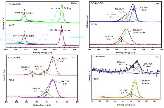 Figure 6 shows the high-resolution X-ray photoelectrons spectroscopy (XPS) spectra of ZIF-8 and C/N-ZnO-500. The Zn 2p spectra of both ZIF-8 and C/N-ZnO-500 were fitted to two typical characteristic peaks, corresponding to Zn2+. The O1s spectra of ZIF-8 revealed peaks associated with Zn-O-C/-OH at 531.66 eV and adsorbed oxygen at 532.85 eV. Conversely, the O1s spectrum of C/N-ZnO-500 exhibited three peaks: Zn-O at 530.21 eV, an oxygen vacancy (VO) at 531.00 eV, and adsorbed oxygen at 532.85 eV [26,27]. The C1s spectrum of ZIF-8 displayed peaks for amorphous carbon at 284.77 eV and C-N at 286.1 eV. Conversely, the C1s spectrum of C/N-ZnO-500 showed three characteristic peaks: amorphous carbon at 284.8 eV, C-N bond at 286.50 eV, and C-O bond at 288.76 eV, confirming the successful doping of carbon into ZnO. The N1s spectrum of ZIF-8 exhibited peaks corresponding to the C=N-Zn bond at 398.88 eV and the N-C bond at 399.77 eV. In contrast, C/N-ZnO-500 displayed peaks corresponding to the O-Zn-N bond at 398.88 eV and the N-C bond at 399.32 eV, substantiating the successful incorporation of carbon into ZnO [28,29].