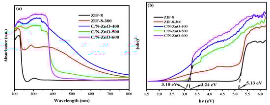 Figure 7a shows the ultraviolet (UV)-visible diffuse reflectance absorption spectra of the photocatalysts. ZIF-8 is predominantly UV-absorbing, with a small visible absorption range and a distinct characteristic light absorption band edge at about 250 nm. Compared to the ZIF-8 and ZIF-8-300 samples, the light absorption range of the C/N-ZnO-x series samples changed significantly. At temperatures of 300 °C and 400 °C, the light absorption peaks show a transition state due to the decomposition of ZIF-8 and the incomplete generation of ZnO, and strong light absorption occurs in the region of 400–500 nm. At temperatures of 500 °C and 600 °C, the decomposition of ZIF-8 is complete, and the light absorption consists entirely of the characteristic peaks of ZnO. Due to the doping of elements C and N and the presence of oxygen vacancies (VO), the range of the light absorption in the C/N-ZnO-x series of samples changes significantly from ultraviolet to visible light in the range of the responsive absorption. Among them, the C/N-ZnO-400 sample has the largest visible light absorption intensity. From the band gap spectrum fitted in Figure 7b, it can be seen that the band gaps of the generated ZnO changed significantly with different calcination temperatures; the band gap of ZIF-8 was 5.13 eV, while that of C/N-ZnO-500 was 3.10 eV, which suggests that the doping of the C and N elements, as well as the presence of the oxygen vacancies (VO), can regulate the energy band structure of ZnO, which is favourable for improving the light absorption range and enhancing photocatalytic performance [30,31].