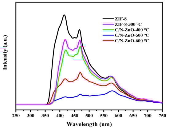 Figure 8 shows the photoluminescence spectra of the prepared samples. It can be seen that the emission peaks of the ZIF-8 and ZIF-8-300 samples have higher intensities, which indicates that their photogenerated carrier recombination rates are fast whereas, in the C/N-ZnO-x series of samples, the emission peaks of ZnO are usually divided into near-ultraviolet and visible emission regions, where the emission peaks at about 390–400 nm are due to the intrinsic luminescence process generated by the jump of electrons from the conduction band to the valence band in their excited state. Luminescence in the visible region at about 430–500 nm is due to oxygen vacancy (VO) or zinc vacancy (Vzn) defects, with oxygen vacancies being the most common cause, which can form localised states of free excitons and cause blue-light emission at room temperature. The emission peaks at about 500~550 nm are usually attributed to the presence of zinc interstitials. From the transformation of ZIF-8 to ZnO, it can be seen that the intensity of the emission peaks of the oxygen vacancies gradually increases compared to the other defect peaks, and the intensity of the photoluminescence peaks decreases and then increases with the increase in calcination temperature. The C/N-ZnO-500 sample has the lowest intensity of the excitation peaks, which suggests that it has the lowest photogenerated electron–hole complexation rate, which is attributed to the doping of the C and N elements and the synergistic effect of the presence of oxygen vacancies (VO) and the change in morphology and size. The synergistic effect of the presence of the C and N elements and oxygen vacancies (VO) and the change of morphology size, as well as the lower photogenerated electron–hole complexation efficiency, is favourable for the improvement of photocatalytic performance [8].