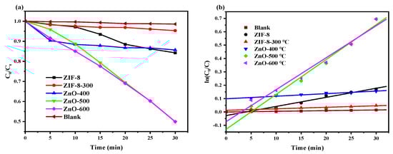 Figure 9a shows the photocatalytic degradation of methyl orange (MO) by ZIF-8 and C/N-ZnO-x under simulated visible light. The photocatalytic degradation efficiencies of the ZIF-8 and ZIF-8-300 samples were very low within 30 min, while the photocatalytic rates of the C/N-ZnO-x series of samples were significantly enhanced compared with those of the ZIF-8 and ZIF-8-300 samples, in which the C/N-ZnO-500 possessed the largest photocatalytic degradation efficiency, with a degradation efficiency of 55%. The enhanced photocatalytic performance is mainly attributed to the synergistic effect of a certain amount of C- and N-doping, the presence of oxygen vacancies, and a large specific surface area, which is found to follow a first-order kinetic curve equation by fitting the photocatalytic degradation process, in which C/N-ZnO-500 has the largest slope, which also indicates that it has the largest photocatalytic degradation efficiency.