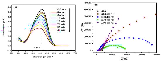 Figure 10a shows the variation curve of the light absorption of the MO solution with time during the photocatalytic degradation over C/N-ZnO-500. The MO solution has a typical characteristic absorption peak at 464 nm and, with the prolongation of the photocatalytic time, the light absorption intensity of the MO solution gradually decreases and the concentration of MO gradually decreases, which indicates that the molecules of the MO solution decompose through a chemical reaction with the active groups during the photocatalytic process. Figure 10b shows the electrochemical impedance curves of the prepared samples. Except for ZIF-8, C/N-ZnO-500 has the minimum curvature arc radius, which suggests that C/N-ZnO-500 has the smallest impedance value among the C/N-ZnO-x series of samples, which also suggests that it has the minimum photogenerated carrier mobility, which is conducive to the enhancement of photocatalytic efficiency.