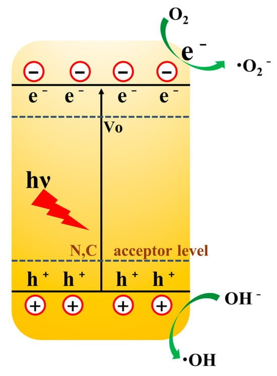 Figure 11 shows the mechanism of the photocatalytic degradation of the MO solution for the CN-ZnO-x sample. The photocatalyst absorbs photons, and the electrons in the valence band become excited and jump to the conduction band while holes are left in the valence band, forming a photogenerated electron–hole pair, a part of which migrates to the catalyst surface where the electrons undergo a reduction reaction with oxygen and the holes undergo an oxidation reaction with hydroxide ions. The elements C and N, as the acceptor energy levels, are able to capture electrons jumping from the valence band [32,33], which facilitates the separation of the photogenerated electrons, and the (VO) of the oxygen vacancy as the donor energy level is able to release electrons to make them jump to the conduction band and increase the carrier concentration. The separation of photogenerated electron holes and the increase in carrier concentration are both favourable to the photocatalytic reaction’s efficiency [34,35]. The doping of C and N elements and the synergistic effect of oxygen vacancies (VO) can not only regulate the energy band structure and enhance the absorption of visible light, but also facilitate the separation of photogenerated electron–hole pairs and increase the concentration of photogenerated carriers. In addition, with the special morphology of the MOF precursor, it can provide a large specific surface area for the C/N-ZnO material, which provides more active sites for the degradation and is conducive to the improvement of the photocatalytic reaction rate.