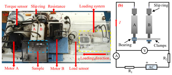 Schematic diagram of the test equipment. (a) Rolling current-carrying tribometer; (b) schematic diagram of the current-carrying system.