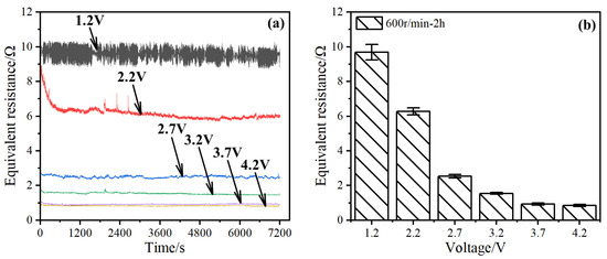When the voltage was 1.2 V, the equivalent resistance curve exhibits severe fluctuations (Figure 2a). As the voltage increased, the fluctuation in the equivalent resistance decreased, and the value of the entire curve decreased. When the voltage was 2.7 V, no evident burrs were observed in the equivalent resistance curve. When the voltage increased to 3.7 and 4.2 V, the two curves almost coincided and were close to the shape of a straight line. Based on the resistance curves between 6000 and 7200 s, the average value decreased with increasing voltage and eventually stabilized (Figure 2b). The average contact resistance of the bearing reached the lowest at 3.7 and 4.2 V, which was only 0.8 Ω.