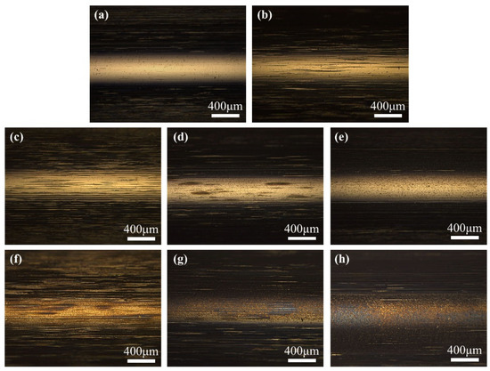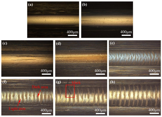 Optical microscope morphology of outer race surface (×50); (a) Original; (b) 0 V; (c) 1.2 V; (d) 2.2 V; (e) 2.7 V; (f) 3.2 V; (g) 3.7 V; (h) 4.2 V.