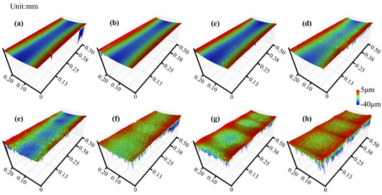 Three-dimensional morphology of outer race surface; (a) original; (b) 0 V; (c) 1.2 V; (d) 2.2 V; (e) 2.7 V; (f) 3.2 V; (g) 3.7 V; (h) 4.2 V.