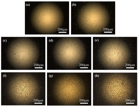 Optical microscope morphology of bearing ball (×100); (a) original; (b) 0 V; (c) 1.2 V; (d) 2.2 V; (e) 2.7 V; (f) 3.2 V; (g) 3.7 V; (h) 4.2 V.