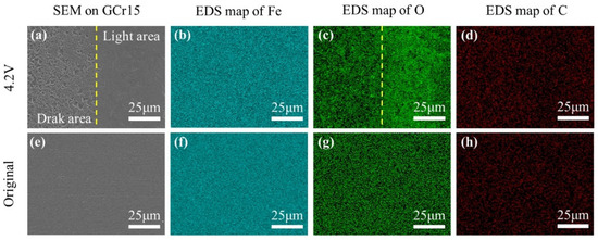 EDS maps of outer race surface of bearing; (a–d) corrugated damage area on the sample at 4.2 V; (e–h) original sample.