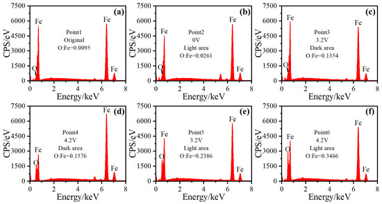The raceways were still protected by grease during the mechanical rolling, and the O:Fe atomic ratio increased slightly to 0.0261 (Figure 11b). As the voltage increased to 3.2 V and 4.2 V, the degree of bearing breakdown increased and there was evident electrical erosion on the bearing surface. The O:Fe atomic ratio in the corrugated damaged area increased intensely in both the dark and light areas. The degree of oxidation in the dark areas (Figure 11c,d) was lower than that in the light areas (Figure 11e,f). The results of EDS surface scanning and point scanning showed that the degree of oxidation of the dark area with dense electrical erosion was lower.