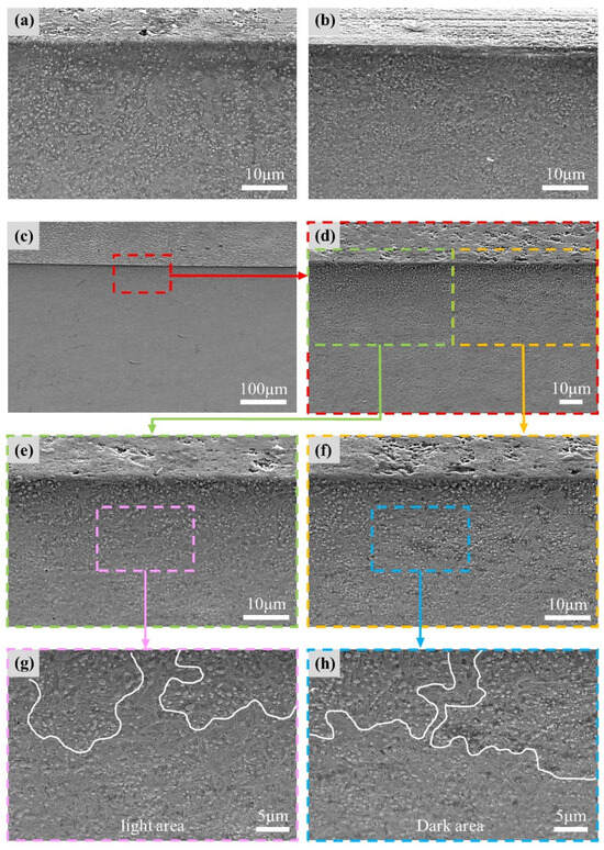 The original structure of the bearing steel was fine martensite with uniformly distributed carbides (Figure 12a). At 2.2 V, the rolling surface undergoes electrical erosion (Figure 9d); however, no structural changes are observed in the subsurface layers (Figure 12b). As shown in Figure 12c,d, the corrugated damage was positioned on the surface at 4.2 V. Carbides are enriched in the subsurface layer (Figure 12d). By observing the light and dark areas separately, the phenomenon of carbide enrichment became clearer (Figure 12e,f). At higher magnification, it could be observed that the enrichment degree of carbide in dark area (Figure 12h) was higher than that in light area (Figure 12g). Based on a comparison of the surface morphologies (Figure 9 and Figure 10) and subsurface structures (Figure 12), the degree of carbide enrichment was related to the degree of electrical erosion. During discharge, the transient high temperature caused melting and splashing, forming erosion pits. The high temperature around the discharge position caused the decomposition of martensite in the heat-affected zone. Supersaturated C atoms precipitated from martensite and combined with metal Fe to form carbides [32]. Because of the extremely short discharge process, the heat-affected zone was concentrated in the subsurface, resulting in the enrichment of carbides.