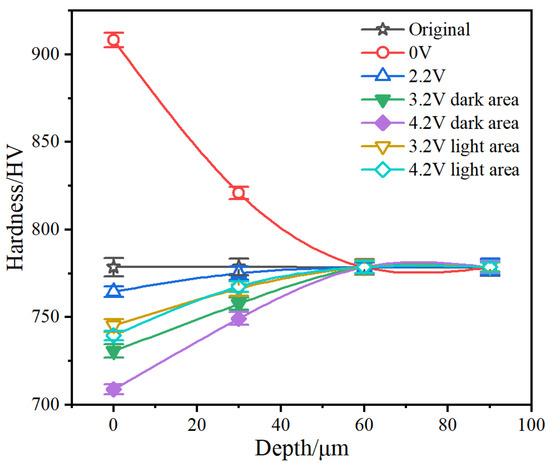 The mechanical performance of the steel was closely related to its microstructural changes. To analyze the effect of corrugated damage at different voltages on mechanical performance, the hardness of the subsurface of the worn-out samples was tested along the depth direction (Figure 13).