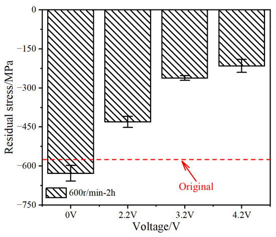 Negative stress indicates the residual compressive stress; the higher the stress value, the greater the hardness. The residual compressive stress of the original sample was 570.01 MPa. After pure mechanical rolling, the residual stress increased to 628.27 MPa. When the voltage applied to the bearing increased from 2.2 to 4.2 V, the residual compressive stress decreased from 430.46 to 215.27 MPa. Owing to the limited resolution of the X-ray residual stress analyzer, it was not possible to identify independent stresses in the dark and light areas. Nevertheless, the results shown in Figure 14 indicate that electrical erosion reduces the mechanical performance of the bearing.
