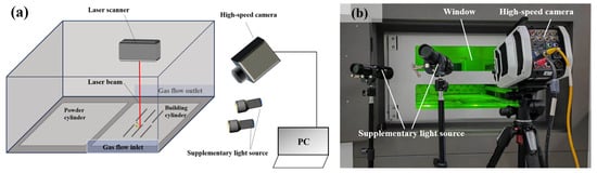 The experiment was carried out using a Large-scale Powder Bed Fusion-Laser Melting experimental platform independently customized by Dongguan University of Technology. With two YLR-500-SM fiber lasers (500 W, CW, Emission Wavelength 1070 nm, IPG, Massachusetts, USA), the printing format meets 600 mm × 300 mm × 400 mm (this experiment uses a single laser to print), the printing material used is 316 L, and its chemical composition is shown in Table 1. The Phantom V1212 high-speed camera (Phantom, New Jersey, USA) was used (with SIGMA 105 mm F2.8 lens, SIGMA, Kawasaki, Japan; with two 60 W focusing flashlights to assist shooting) with a shooting speed of 4000 fps; an exposure time of 240 μs was used to shoot the spatter image with a pixel size of 1280 × 720 under different laser power and powder layer thickness. The shooting schematic diagram is shown in Figure 1a, and the actual experiment scene is shown in Figure 1b.