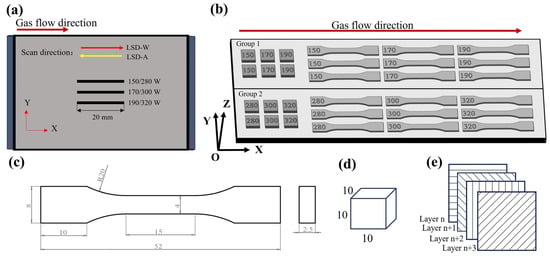 The spatter behavior shooting scheme and sample printing scheme of this experiment are shown in Figure 2. The selection of specific experimental parameters is shown in Table 2. The powder layer thickness is set to 0.03 mm and 0.05 mm, respectively; the powder layer thickness of 0.03 mm corresponds to the lower laser power (150 W–190 W), the powder layer thickness of 0.05 mm corresponds to the higher laser power (280 W–320 W), and the laser scanning speed is set to 1000 mm/s. Using a high-speed camera to capture the spatter behavior in the PBF-LM process is shown in Figure 2a; the single-pass laser scanning length was 20 mm. Each experiment scans the laser three times in sequence, with three different laser powers set, and each laser power corresponds to two different laser scanning methods: laser scanning direction against the gas flow (LSD-A) and laser scanning with the gas flow (LSD-W). The high-speed camera records the spattering behavior at 0.03 mm or 0.05 mm powder layer thickness, whereby each parameter set is repeated three times. Figure 2b shows the placement scheme of the samples printed in this experiment (samples were printed with a powder layer thicknesses of 0.03 mm and 0.05 mm, respectively). The size of the tensile sample is shown in Figure 2c, the size of the block sample is shown in Figure 2d, and the scanning strategy in the printing process is shown in Figure 2e. The procedure was as follows: Tensile tests were performed on printed specimens using the INSTRON 5982 tensile machine (INSTRON, Massachusetts, USA) at a strain rate of 0.5 mm/min. The printed 10 mm × 10 mm × 10 mm block specimen was ground with 600–2000 grit sandpaper and polished with 1.0 grit diamond polishing paste. Then, a liquid corrosion solution with a ratio of 10 mL hydrofluoric acid, 20 mL nitric acid, 30 mL hydrochloric acid, and 40 mL water was used to corrode the polished surface of the sample for 55 s. The microstructure analysis was carried out using the SIGMA 500 scanning electron microscope (Carl Zeiss, Oberkochen, Germany). The surface roughness of the sample was tested using an optical profiler of Bruker Contour GT-K 3D (Bruker, Karlsruhe, Germany). This experiment evaluates and analyzes spattering behavior using volumetric energy density (VED). The expression for VED is: