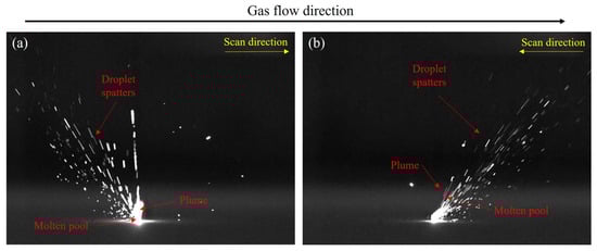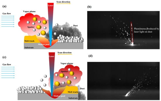 The number of spatters generated during LSD-W is greater than that under LSD-A. One explanation for this could be that metal powder and laser-generated metal vapor are sprayed in the opposite direction of the scanning direction. As shown in Figure 9a, the droplet spatters caused by steam entrainment are sprayed backward with the spraying direction of the metal vapor. With LSD-W, the flow direction of the protective gas in the molding bin is opposite to the spray direction of the spatters. The generated metal vapor has a certain blocking effect on the protective gas flow so that the protective gas cannot blow away the dust on the upper part of the powder layer of the laser pre-printing area in time. The laser beam has to pass through the dust and act on the upper part of the pre-printing powder; as shown in Figure 9b, the scattering phenomenon caused by laser irradiation of dust during the actual printing process is formed, resulting in unstable laser energy input acting on the powder layer, which, in turn, disrupts the uniformity of the molten pool flow and increases the number of spatters. As shown in Figure 9c,d, the direction of flow of the shielding gas in LSD-A is the same as that of the spray jet. The metal steam will not hinder the protective gas so that the protective gas can blow away the dust generated in time. The laser input is not affected by the dust and can stably act on the metal powder. The molten pool can flow uniformly along the laser scanning direction, so the number of spatters generated by LSD-A is less than that generated by LSD-W. This phenomenon can be clearly observed in the Supplementary video provided.